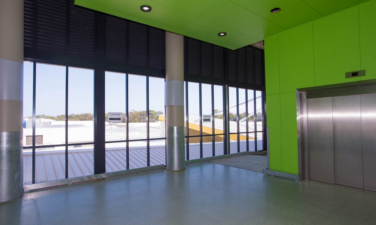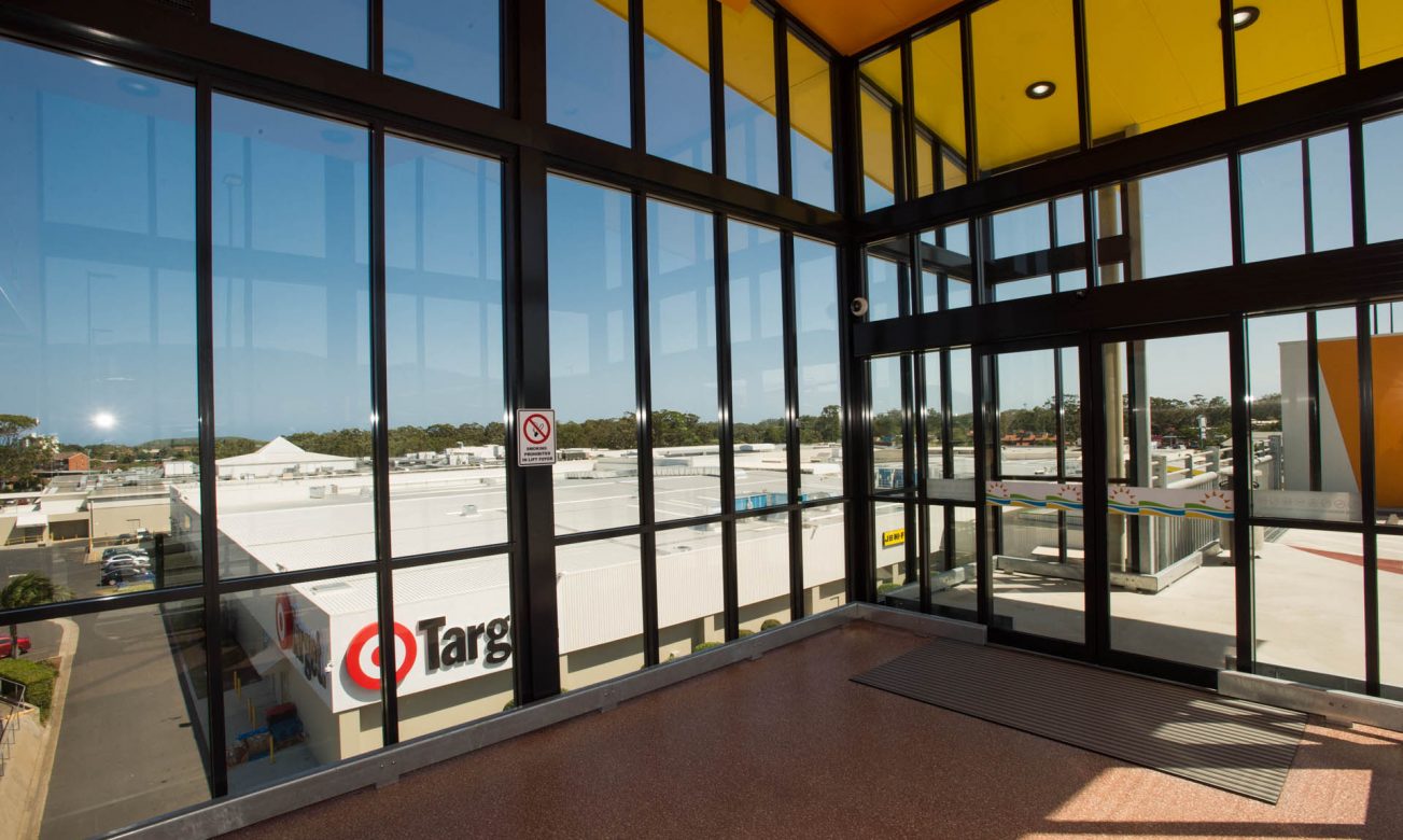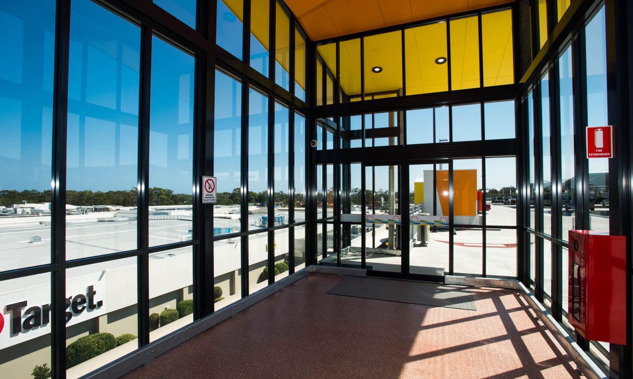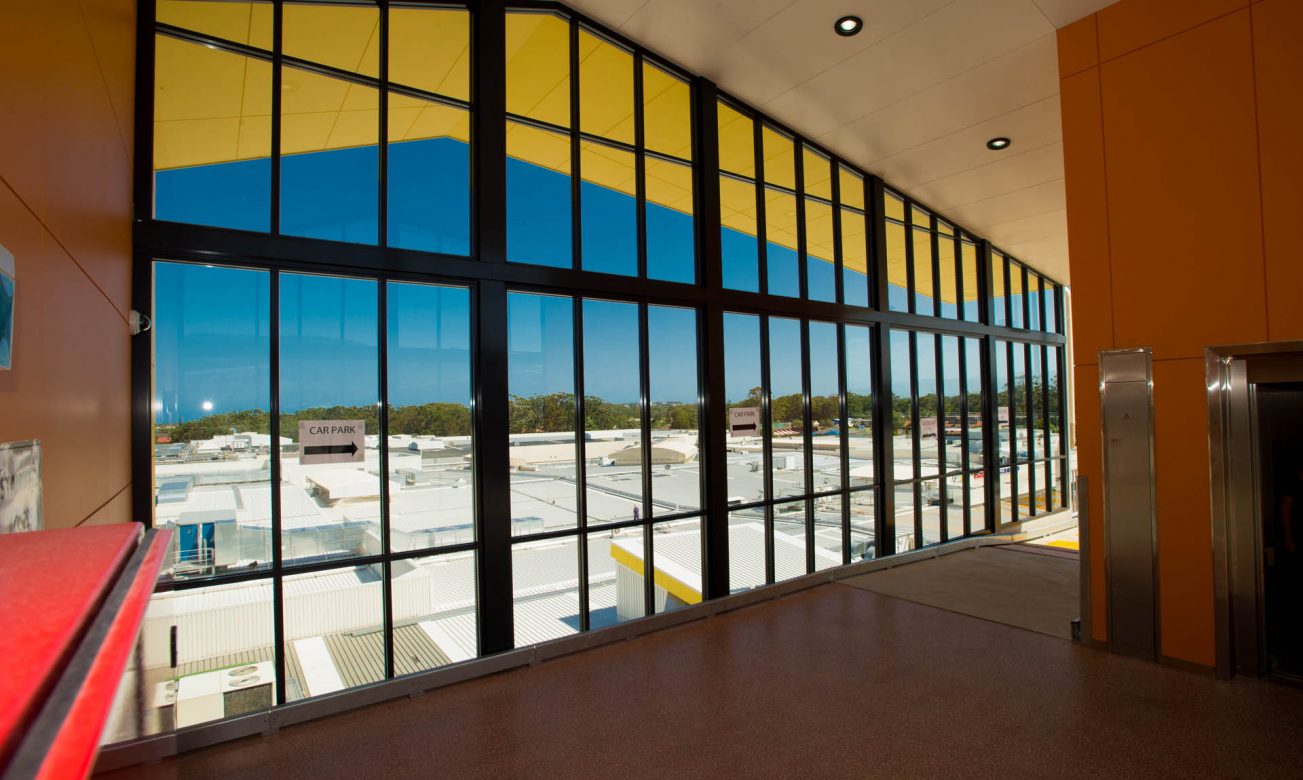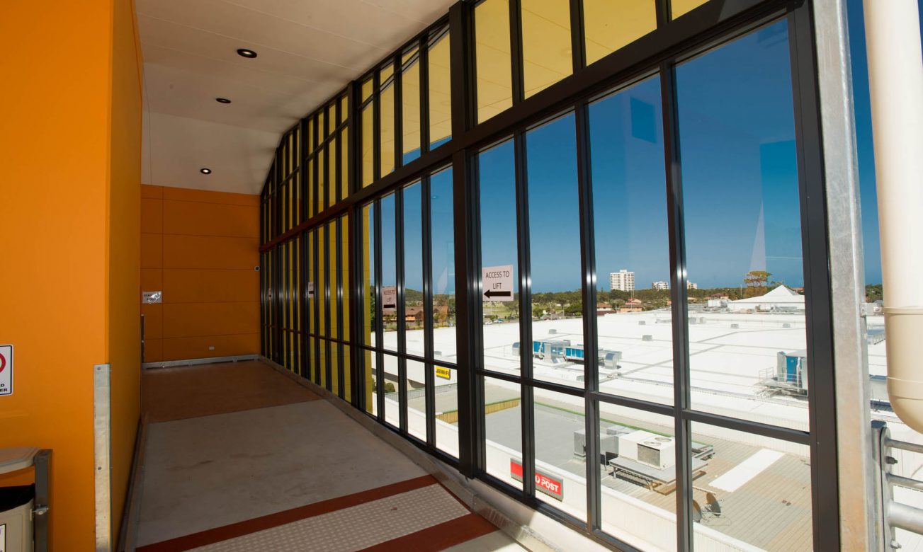 Large external aluminium framed glazed walls and automatic doors of the Park Beach Plaza’s multi story car park.