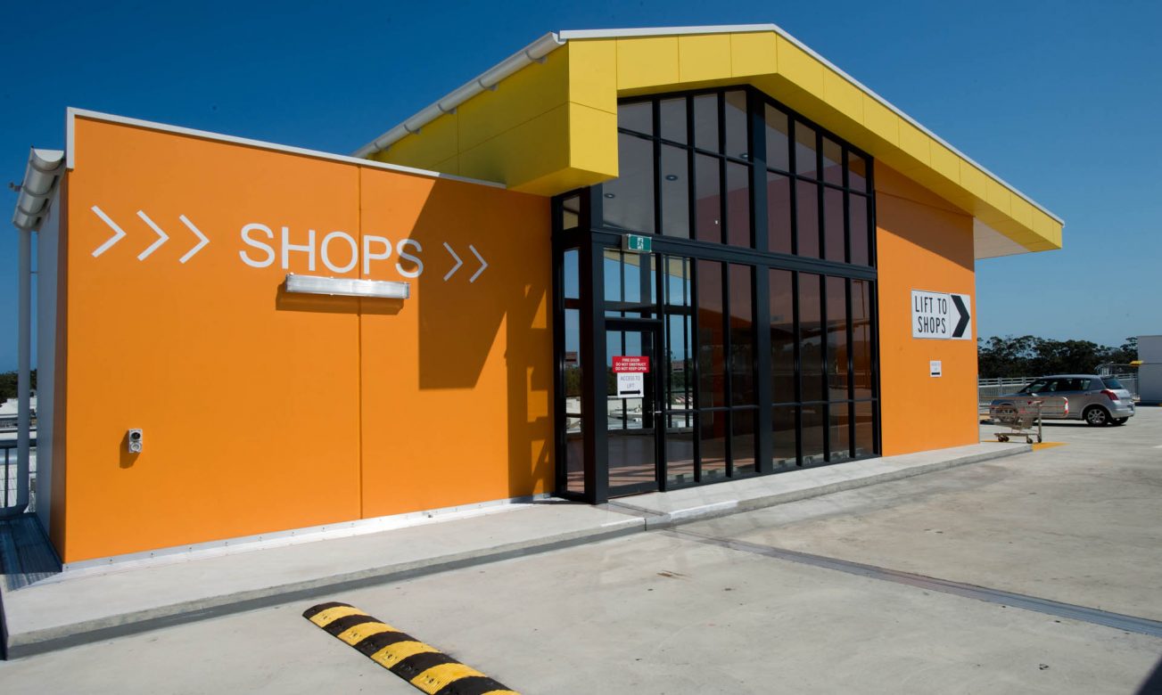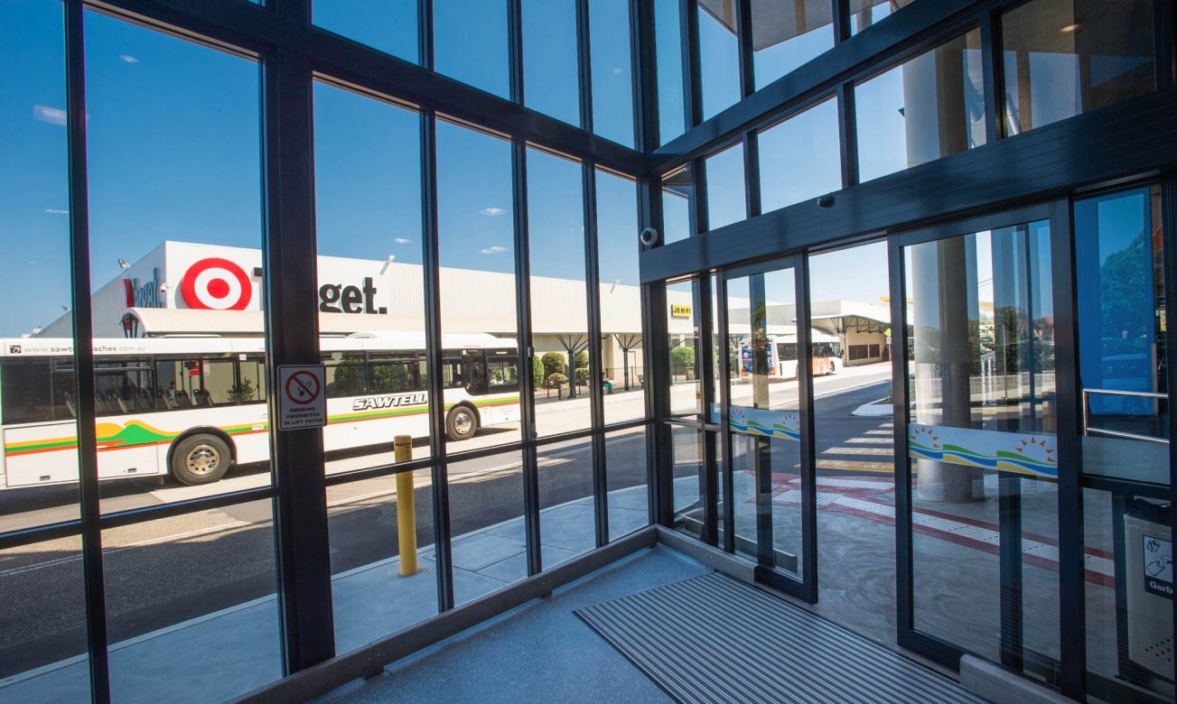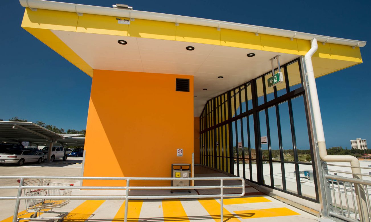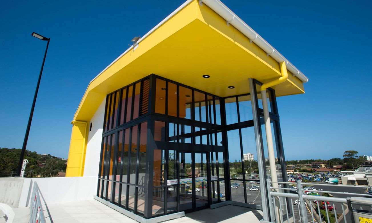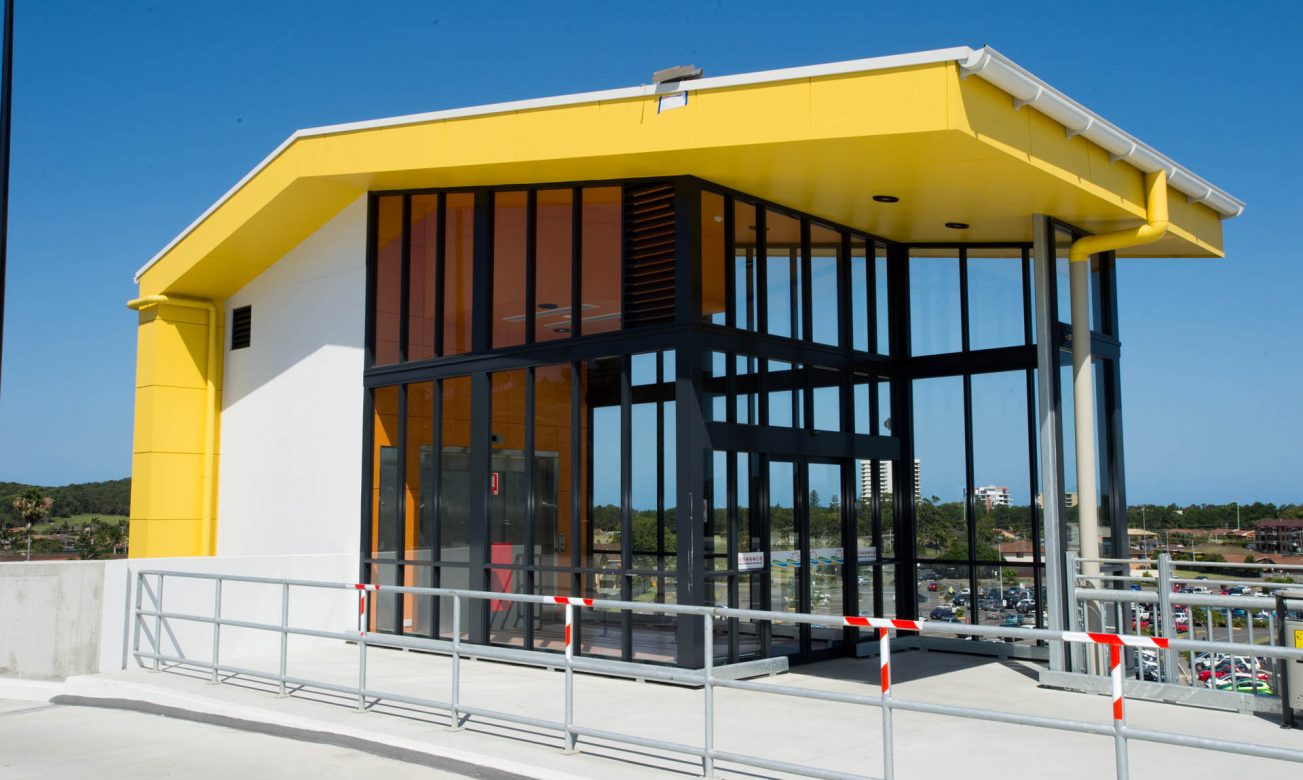 Large external aluminium framed glazed walls and automatic doors of the Park Beach Plaza’s multi story car park.